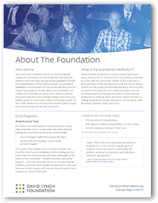 The David Lynch Foundation (DLF) is a 501(c)(3) nonprofit organization, founded in 2005, that addresses the epidemic of trauma and toxic stress among at-risk populations through the implementation of the evidence-based Transcendental Meditation (TM) technique. DLF has served more than 500,000 children and adults worldwide, with a focus on underserved middle school and high school students, veterans suffering from post-traumatic stress and their families, and women and children survivors of domestic violence and sexual assault. DLF also works with those in recovery, the homeless, prison populations, people living with HIV/AIDS, and others.